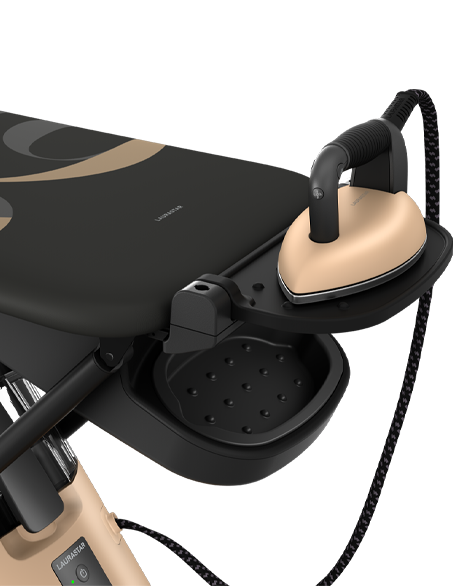 Equipped with all Laurastar's latest technological innovations, the Laurastar Smart 1980 all-in-one system comes in a sober, elegant matte gold finish. Its Universalcover ironing board cover is also specially designed in the colours of this anniversary collection. It all comes with a soft and resistant storage case.